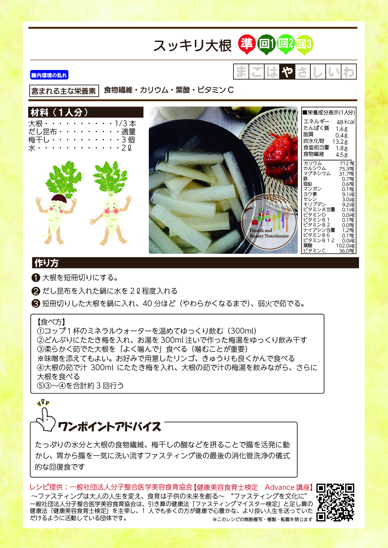 - 梅流し(スッキリ大根):ファスティング後の消化管洗浄の儀式的な回復食です。大根の食物繊 維と梅干しで腸を活発にし、通常の食事再開に備える助けになります 。もしくは、お米が食べ たい方はお粥もいいでしょう。