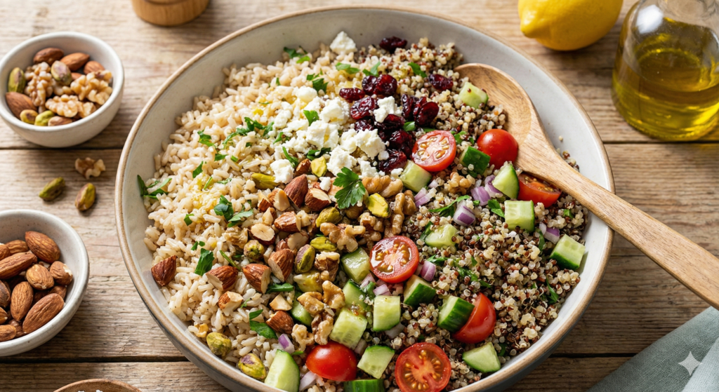 - キヌアとナッツのライスサラダ: サッパリとヘルシーで、キヌアやひよこ豆で良質なタンパク 質、ビタミン、ミネラルを摂取できます 。