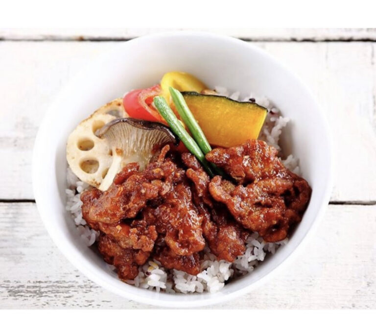 お湯で戻した大豆ミート(フィレタイプ)に下味をつけて焼き、醤油・甜菜糖・ケチャップ・酢などで作ったタレを絡めてご飯に乗せます。