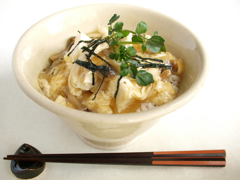 だし汁に人参・きのこ・生姜を入れて煮込み、生湯葉を加えます。片栗粉でとろみをつけ、ご飯と豆腐の上からたっぷりかけます。