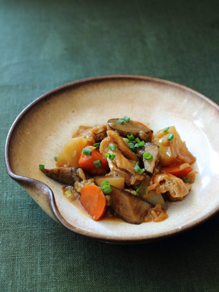 だし汁できのこやレンコンを煮て、味噌・塩・白練りごまで味付けし、最後に豆乳を加えて温めます(沸騰させないのがコツ)。