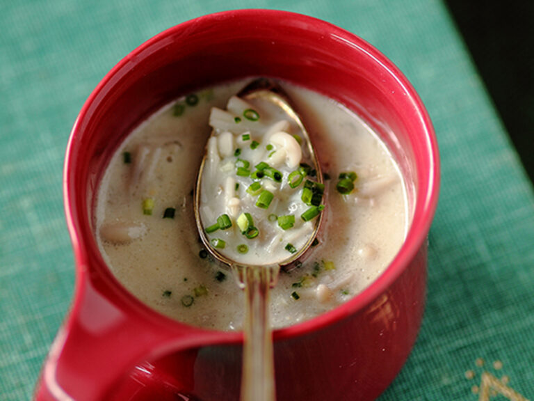 雑穀(もちきび)と海藻(もずく)のとろみで満腹感が得られ、ミネラル(マグネシウム・亜鉛など)も補給できる温かいスープです。