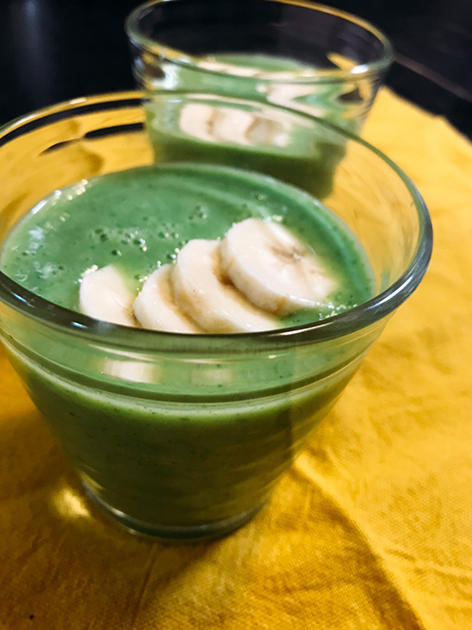 小松菜(またはモロヘイヤ)、バナナ、パセリ、水、レモン汁などをミキサーにかけるだけの基本ドリンク。